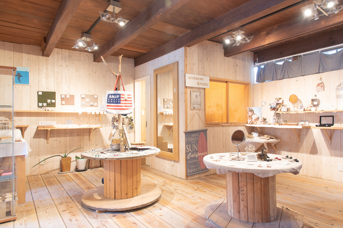また、販売スペースに工房を設け、主に土・日・祝にその工房にてアクセサリーを製作しています。